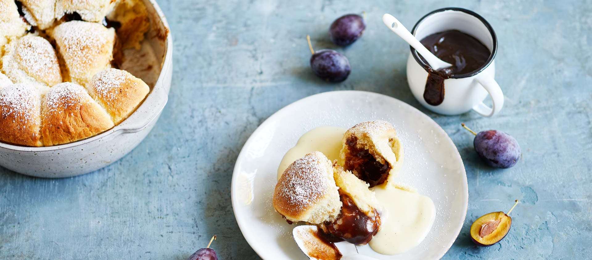 Estos deliciosos panecillos dulces de levadura, también conocidos como Rohrnudeln (rollitos cannellini), son facilísimos de preparar. Servidos tibios, seguro que encantarán a todos. Ingredientes para los “Buchteln”: 1 paquete de Ruf masa de levadura 160 ml de agua tibia 60 g de margarina blanda o mantequilla Un poco de harina común para la superficie de trabajo 200 g de mermelada de ciruela 40 g de mantequilla derretida Azúcar glas para espolvorear Ingredientes para la salsa de vainilla: 300 ml de leche 200 ml de nata 1 vaina de vainilla 30 g de azúcar 1 huevo mediano 15 g de almidón de maíz 1 pizca de sal Preparación de los “Buchteln”: Pone la mezcla base y la levadura en un bol y mezcla. Agrega el agua tibia y la margarina o mantequilla ablandada. Con una batidora eléctrica (con gancho para masa), mezcla a alta velocidad hasta obtener una masa suave. La masa de...