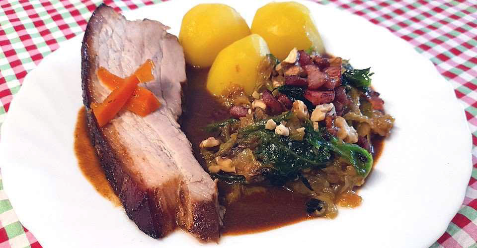 No siempre tiene que ser filete: ¡una panceta de cerdo perfectamente preparada con deliciosa col rizada deleitará incluso a los más gourmets! Ingredientes para 4 personas: • 1,5 kg de carne de panceta ahumada Para la marinada: • 250 ml de caldo de verduras• 50 ml de salsa de soja oscura• 30 g de pasta de pimentón picante o suave (al gusto)• 1 cucharadita de pimienta• Sal Para la salsa:• 100 g de zanahorias cortadas en dados gruesos• 100 g de apionabo cortado en dados gruesos• 100 g de raíces de perejil cortadas en dados gruesos• 100 g de puerros en rodajas• 100 g de chalotas cortadas en dados gruesos• 10 g de ajo picado grueso• 30 g de pasta de tomate• 250 ml de caldo de verduras• 10 ml de salsa de soja oscura• Sal Para las verduras:• 800 g de col rizada congelada• 150 g de bacón en dados• 80 ml de agua Preparaci&oa...